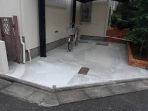 今回、雨樋からの雨水の排水経路を花壇に変更したうえで、駐車場の床面左官補修を行いました。