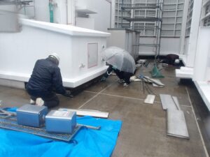 - 解体工事(ウレタ防水ン仕上げ改修に伴い、既存防水保護板撤去)