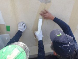 - 下地補修工事(サンダーによる切り込みを要しない、テクスチャーノンカット工法を採用。)