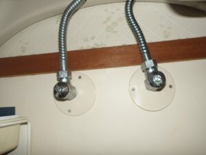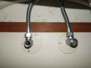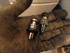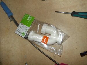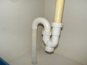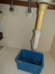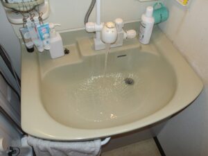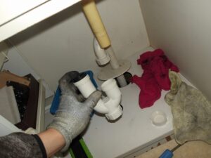 洗面台の排水が流れが悪いとの苦情があり、現場対応しました。現場は築30年超えのマンションですが、排水管に鉄管が使われているため、鉄管にサビが蓄積し、錆の膜が発生していました。この膜を、ドライバーで削り取り、排水経路を確保しました。Sトラップ部からの漏水も見られたため、Sトラップを交換しました。またお湯が出ないとのことで、止水栓を確認したところ、お湯側の止水栓が閉まっていることが確認できました。しかし、長らく回していなかった止水栓を回すと、案の定漏水したため、止水栓のスピンドル、パッキンも交換し、作業完了です。